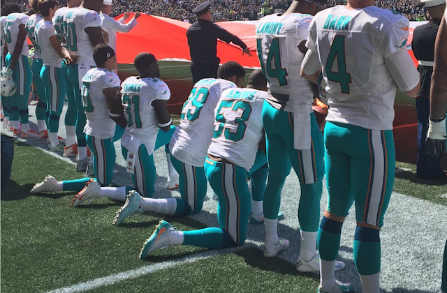 Four members of the Dolphins, who lost to the Seahawks 12-10, took knees during the national anthem. The Sun-Sentinel reported that Steve Ross, the Dolphins' owner, stood by their protest, approaching safety Michael Thomas in the locker room after the game and saying, "Let's get ready to do something about this" after shaking Thomas' hand.