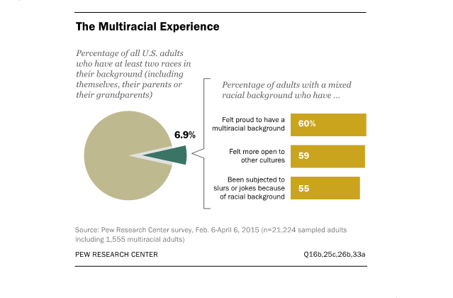 When it comes to discrimination and racism, multiracial folks are not exempt. More than half (55 percent) have been subjected to racial slurs. For biracial adults who count black as part of their background, 57 percent have received poor service based on their race—the same percentage as those who identify solely as black. And 43 percent of multiracial adults who are perceived as black report being unfairly stopped by the police, while 52 percent have been treated unfairly by an employer. Mixed-race people with Asian backgrounds report discrimination at the same rate as single-race Asians. Nevertheless, nearly two-thirds (60 percent) of multiracial people say they are proud of their mixed-race background, and 59 percent say it has made them more open to other cultures.