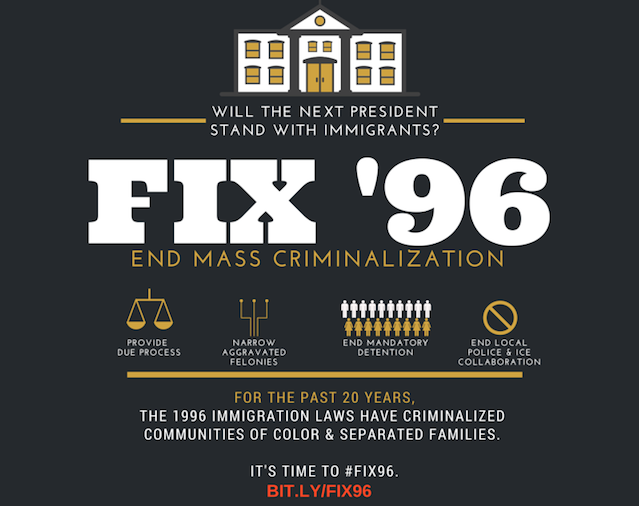 Like the infamous crime bill of 1994, the ’96 immigration legislation grew out of a toxic political narrative that blurred race and criminality and hyped up fears of crime to justify punitive policies. Also, like the crime bill, the immigration laws exacted their heaviest toll on communities of color. “Tough on crime” policies unleashed on these communities hyper-aggressive policing, leading to the profiling, arrest, prosecution and incarceration of ever greater numbers of Black and Brown people. Immigrants, overwhelmingly people of color, were caught up in the dragnet, and thanks to the ‘96 laws, many were now subject to detention and deportation as a result of their convictions.
