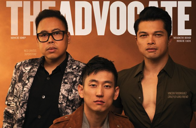 The Advocate's March 2019 issue explores the changing visibility of Asian-American entertainers in the LGBTQ community via the experiences of Vincent Rodriguez III ("Crazy Ex-Girlfriend"), Jake Choi ("Single Parents") and Nico Santos ("Crazy Rich Asians").