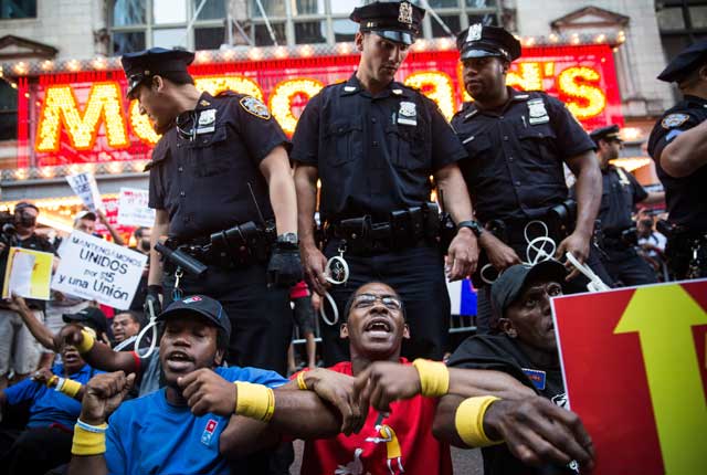 Fast food workers are showing resolve. Today's strikes and protests in more than 100 cities are seeing arrests as workers stage sit-ins in front of McDonald's, Burger King and other fast food restaurants and refuse to move. The addition of civil disobedience to the two-year-old fight for a $15-an-hour minimum wage is new and a follow-through on an idea discussed at a first-ever workers convention this July. Also new: an invitation to home care workers to join their fight for a higher minimum wage and the right to unionize without retaliation. Below, some of what's happening in cities around the country from Nevada to Minneapolis to San Diego. And check this USAToday map for a status update on the states responding to minimum wage increase demands.