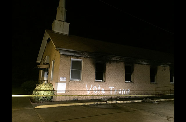 Last night (November 1), arsonists set fire to Hopewell Baptist Church, which has stood for over 111 years in Greenville, Mississippi, spray painting “Vote Trump” across the burned exterior. It is being investigated as a hate crime, and the Greenville Police Department reports that there is a person of interest, but no suspects. No injuries have been reported.