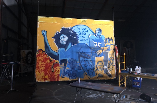 The real excitement around last night's (February 3) game instead took place off the field, where boycotts fueled the ongoing conversation around Colin Kaepernick and the NFL's relationship with racial justice and Black communities. New Orleans artist Brandan "Bmike" Odums, much of whose hometown avoided the game, brought that excitement into his studio and developed a mural that depicts Kaepernick and Eric Reid in protest.