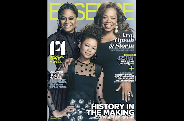 Essence magazine highlights three generations of #BlackGirlMagic on its February cover and accompanying story, which features “A Wrinkle in Time” director Ava DuVernay and stars Oprah Winfrey and newcomer Storm Reid.