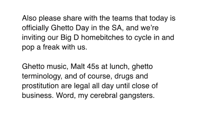 Also please share with the teams that today is officially Ghetto Day in the SA, and we're inviting our Big D homebitches to cycle in and pop a freak with us.