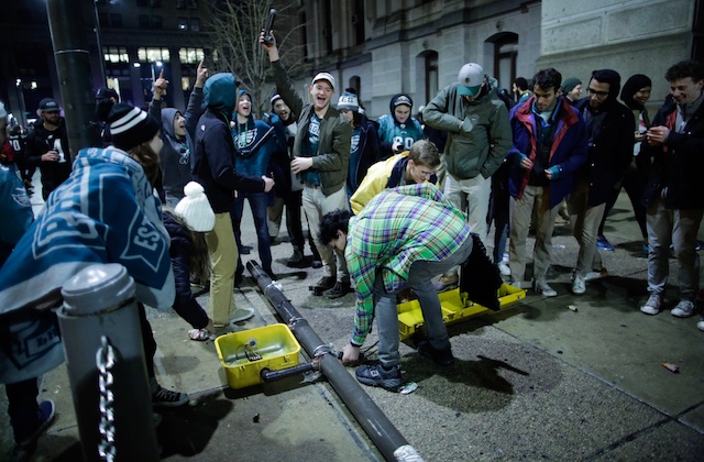 Tens of thousands of Philadelphia sports fans flooded the city's streets last night (February 4) to celebrate the hometown Eagles' 41-33 win over the returning champion New England Patriots in Super Bowl LII. According to U.S. News and World Report, many fans' belligerence led to various instances of property damage, including a collapsed Ritz-Carlton Hotel awning, an overturned car, destroyed traffic poles and two reportedly stolen police horses.