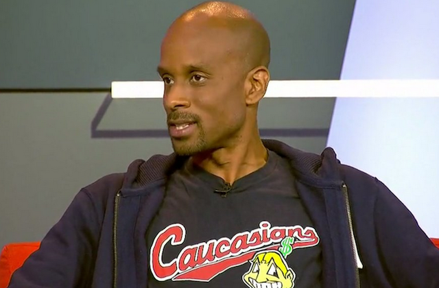 While guest hosting the network’s “Mike & Mike” yesterday (April 7), Jones wore a shirt with a logo reminiscent of the Cleveland Indians’, only instead of showing the team’s name and “Chief Wahoo,” it read “Caucasians” and featured a White man’s face with a dollar sign replacing the original logo’s feather.