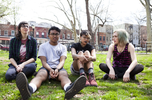 The four members of Aye Nako—vocalist/guitarist Mars Ganito, bassist Joe McCann, guitarist Jade Payne, and drummer Angie Boylan—embody the sociopolitical ethos and sonic textures of punk and DIY. Mars and Jade are people of color, while Mars and Joe identify as trans or multigender. Their experiences of those identities being erased or silenced in indie culture and in broader American society constitute important parts of their lyrics.