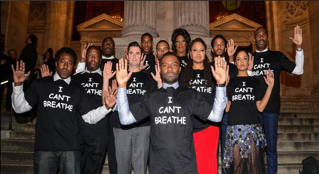 Here's David Oyelowo, E. Roger Mitchell, Wendell Pierce, Omar Dorsey, John Lavelle, Stephan James, Kent Faulcon, Lorraine Toussaint, Andre Holland, Tessa Thompson and Colman Domingo standing on the steps of the New York Public Library, wearing shirts that read "I Can't Breathe." They held up their arms as a sign for "don't shoot."