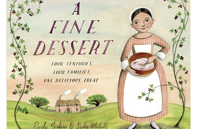 “A Fine Dessert,” written by Emily Jenkins and illustrated by Sophie Blackall, depicts four children throughout history baking a dessert called “blackberry fool” with a parent. Each pairing highlights how the times impact who is in the kitchen. One scene shows a girl and her mother on their tiny farm in 1710. Another shows an enslaved child and her mother preparing the dessert for their owners in a Charleston home 100 years later. The year 1910 brings another mother and daughter pair in Boston, and 2010 San Diego features a boy and his father baking.