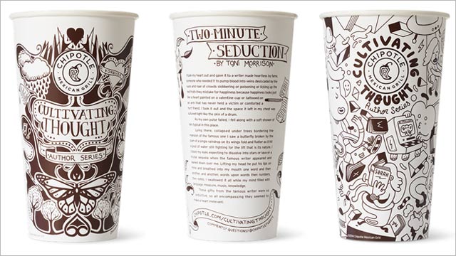 "Cultivated Thought" authors write short, two-minute stories that appear on the backs of Chipotle bags and cups. Other authors who are participating in the series are Chinese-American author Amy Tan and Indian-American comedian Aziz Ansari.
