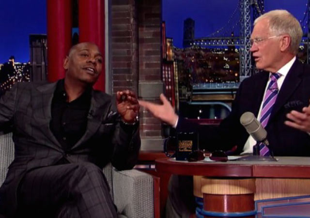 Dave Chappelle sat down with David Letterman on Tuesday ahead of his upcoming shows at New York's Radio City Music Hall later this month. It was Chappelle's first appearance on the show in 10 years, and it looks like he's in good enough spirits to poke fun at his departure from Comedy Central.