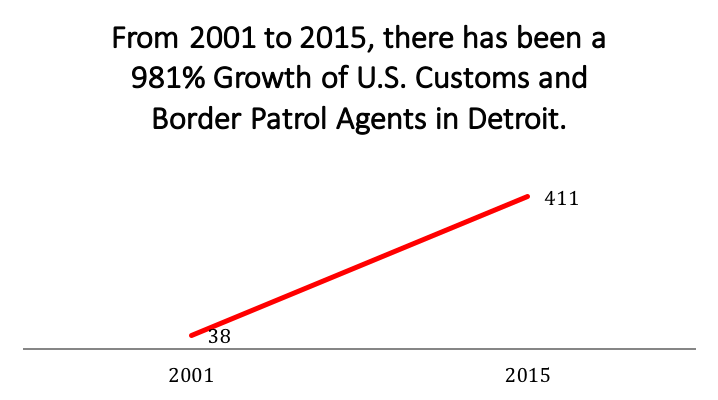 The interlocked dimensions of race, immigration status, and mass detention prevents immigrants (adults and children alike) from any legal immigration relief in Michigan. This issue of dehumanization is particular to Michigan since state incarceration rates are one of the worst in the world. Also, the number of agents in the Detroit sector has grown from 38 to 411 between 2001 and 2015, an increase of 981 percent, by far the fastest rate of growth of any U.S. Border Patrol sector in the United States.