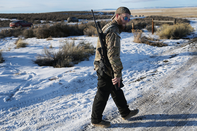 He was accompanied by a number of armed men such as Joe O’Shaugnessy—better known as “Captain O”—who became Internet famous for going into town to drink away donations from followers. Several women—assumedly from the small number who are taking part in the occupation—joined them.