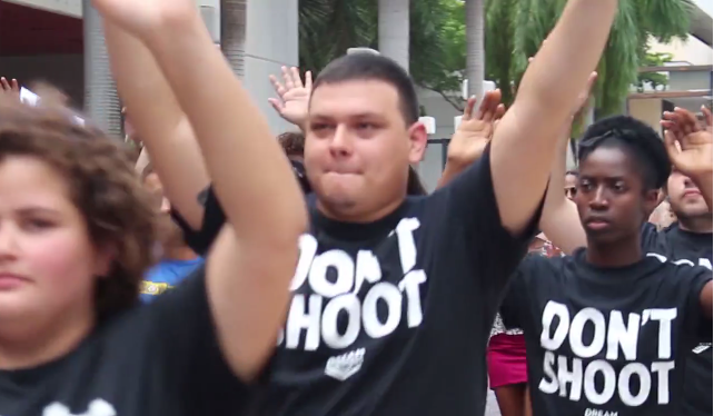 Dream Defenders, the youth group most famous for occupying Florida Governor Rick Scott's office to protest Stand Your Ground laws, has started what it describes as a movement to fight police brutality after the killing of Michael Brown. According to a new video, the group is encouraging young people to gather at the offices of their local U.S. attorneys to demand the end to police violence against unarmed civilians. In the name of Israel Hernandez-Llach, a Colombia-born artist killed by a police officer's stun gun, Dream Defenders staged such an action at the U.S. attorney's office in downtown Miami on August 18. In the video the group encourages activists to make local demands. And among six national demands, Dream Defenders are pushing for front-facing cameras for officers who work in departments with a history of racist policing, and the demilitarization of police.
