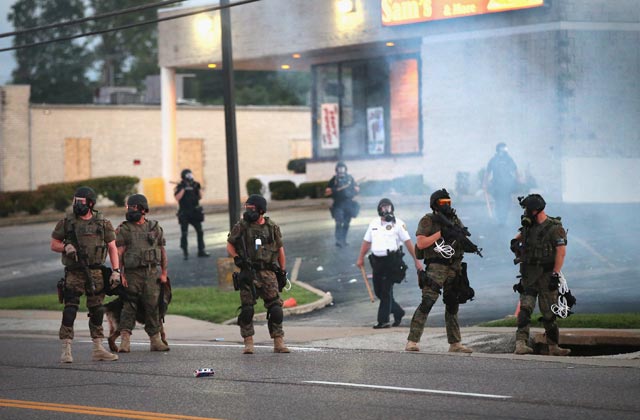 Police, often roaming in tanks and armored trucks with various weapons, have made dozens of arrests in Ferguson since Saturday, the day Michael Brown was killed. News of the police department's refusal to release the officer's name to the public could lead to more unrest.