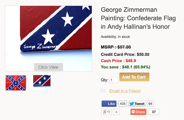 In a move that probably surprises nobody, a Florida gun store owner is auctioning off a painting by Trayvon Martin's killer George Zimmerman... of a Confederate Flag.