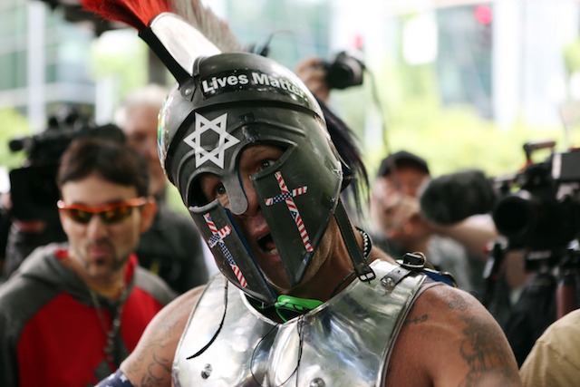 The Berkeley March 4 Trump rally does not involve open White supremacists, but it helps galvanize the Independent Trumpist movement. Seeking revenge over the cancellation of Yiannopoulos’ February speech, Trumpists come dressed for a fight. They include Kyle Chapman, who—after being photographed armored in a shield and helmet while swinging a stick—is turned into the meme “Based Stick Man.” This inspires more militant action, as well as what becomes the alt-right street-fighting uniform.