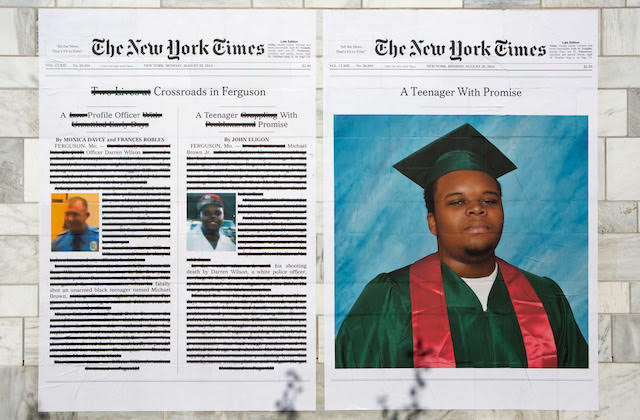Her installations, which first emerged on buildings and subway station walls in Brooklyn last year, feature blown-up panels from print issues of The Times with examples of bias marked in black and red ink. The first work in the series, "A Teenager with Promise," displays side-by-side profiles of Michael Brown and Darren Wilson under the shared headline, “Two Lives at Crossroads in Ferguson." Bell crossed out "Two Lives at," as well as all parts of both profiles that did not explicitly reference Wilson killing the unarmed Brown in Ferguson, Missouri. The piece juxtaposes that edit with another 2014 print page that shows Brown in graduation robes under a headline, "A Teenager With Promise," which originally read, "A Teenager Who Was Grappling With Problems and Promise."
