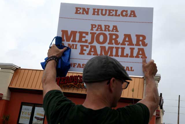 Ty-Eisha Batts, 28, has been on strike since the first fast-food protests in New York City, in November 2012. Because the cost of living was so high she moved from Brooklyn to Greensboro, North Carolina, four months ago. She now works at Hardee's earning $7.75 an hour. It's not enough so Batts is still fighting. "I moved down here, saw a flyer and thought, 'Hey, this is the same thing that's happening in New York,'" she says. "The South is the last to join the fast food strikes I believe but it's really big here, too. It's growing."