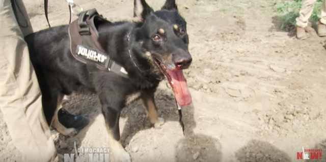 In the chilling "Democracy Now" video below, agents clad in sunglasses can be seen leading dogs into a crowd of people at the construction site of the pipeline, which will run underneath the Missouri River near the Standing Rock Sioux Tribe reservation. Protesters showed host Amy Goodman bite wounds, and at least one dog was filmed with blood on its snout. Some dabbed their faces with wet towels to clear their stinging eyes.