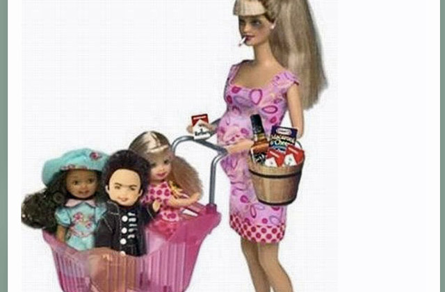 The doll, which is pregnant with a black eye, is seen pushing a grocery cart full of children and beer cases--and carries a bag of cigarettes, hard liquor and a mac and cheese box.