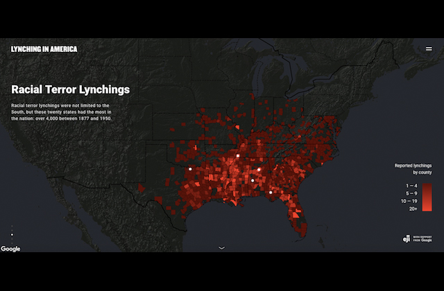 Lynchings and White supremacist terrorism against African Americans in pre-Civil Rights Movement America typically involved local law enforcement, making them difficult to fully investigate. The Equal Justice Initiative (EJI) illuminates the statistics and stories behind lynching with Lynching in America: Confronting the Legacy of Racial Terror in America, a new interactive website launched yesterday (June 13).