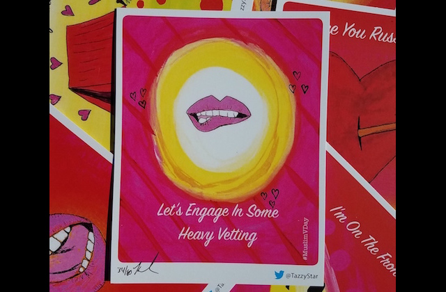 Tanzila "Taz" Ahmed, a community organizer and writer who co-hosts the "#GoodMuslimBadMuslim" podcast, created the Valentine's Day card series. She told Colorlines that she first started making and selling them to challenge Islamophobic media portrayals. She highlights the stereotypes that "all Muslims need to get arranged marriages," as well as "the certain polite, respectability politics-way of Muslim women having to project themselves in public," as examples.