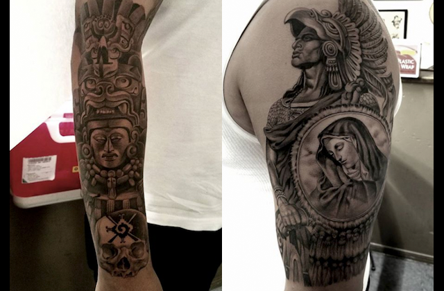 Given the reality of prison segregation, Negrete primarily inked other Chicanx men with symbols of Mexican revolutionaries, Aztec and Mayan figures and text in very specific fonts. "We started the lettering, like [with] Olde English on the stomach, because we wanted to say something about who we were and where we were from, and you could do that with writing."