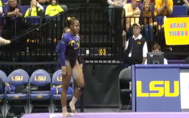 As seen above, in a January competition vs. Alabama, Hall is amazingly strong, incredibly quick, and makes complicated tumbling passes look like a cinch. Her dancing is energetic, her enthusiasm contagious. So cool. She scored a perfect 10 with that floor exercise, and the LSU gymnastics team beat Alabama 197.650-196.825. It was her 3rd perfect 10, at the time.