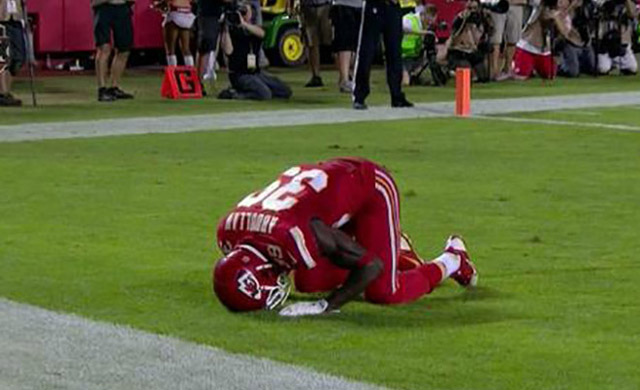 Kansas City Chief safety Husain Abdullah did what most players do when they make an extraordinary play. Abdullah, a 29-year-old veteran, had just intercepted a pass from New England Patriots quarterback Tom Brady and returned it for a touchdown. He then slid down on both knees in the end zone and put his head down in prayer. The move earned him a 15-yard unsportsmanlike conduct penalty.