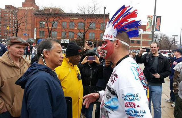 Cleveland's professional baseball team is one of the many American sports franchises still hopelessly clinging to a racist team name, the Cleveland Indians. The team's fans sometimes sport head dresses and face paint in an effort to celebrate the team's mascot. Which leads to awkward enounters like the one above.