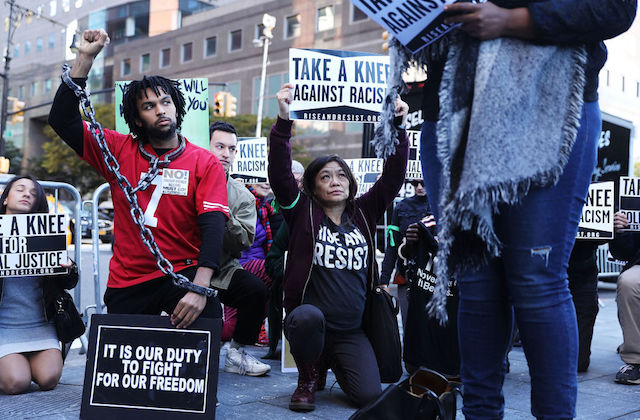 ESPN also reports that nearly two dozen activists gathered outside the meetings in solidarity with protesting players. These protesters, representing a number of advocacy groups, held signs reading, "It is our duty to fight for our freedom" and "White silence = White violence" while taking knees in solidarity with Kaepernick and those who followed him.