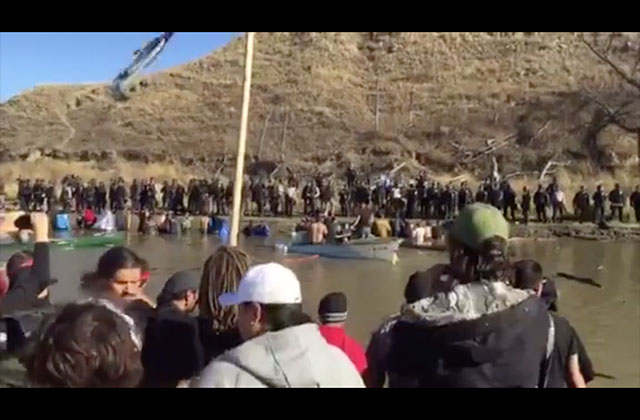 Water protectors continued to cross the river by swimming or using boats, canoes and kayaks, despite police orders to stop. Law enforcement responded with force. Many pipeline opponents remained in the water along the shore once they crossed, as most of the officers were posted on land. One person was arrested under conspiracy charges for “aiding in illegal activity by purchasing canoes and kayaks to be used for crossing the waterway,” reads a police statement.