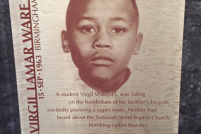 “A-student Virgil Ware, 13, was riding on the handlebars of his brother’s bicycle, excitedly planning a paper route,” reads the caption below a very serious-looking photograph of the boy. “Neither had heard about the Sixteenth Street Baptist Church bombing earlier that day. Two white youths, inflamed by a segregationist rally, drove by on a motor scooter decorated with Confederate flags and shot him.”