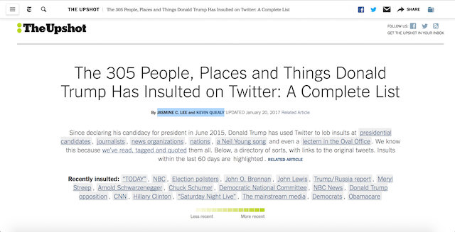 The media giant's "directory of sorts" organizes tweets in categories such as "Media Organizations," "Places" and "Celebrities." Each entry consists of a summary of the tweet and a link to the original missive. For quick reference, the Times highlights Twitter attacks Trump has made within the last 60 days. Visit the Trump insult-tweet tracker produced by reporters Jasmine C. Lee and Kevin Quealy here. It certainly beats reading about 567.8 million articles about the president's Twitter negativity.