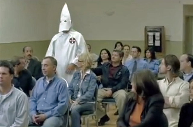 By having a Klan member attend an American Kennel Club meeting, the PETA video--which has subtitles that misspell the white terrorist organization's name as the "Ku Kluk Klan"--attempts, in a comedic way, to compare dog breeding with the Klan's trademark white supremacy. While the ad doesn't mention or depict the beating, castrating, hanging and burning of black people, the image of a Klan member in full regalia conjures up this violence.