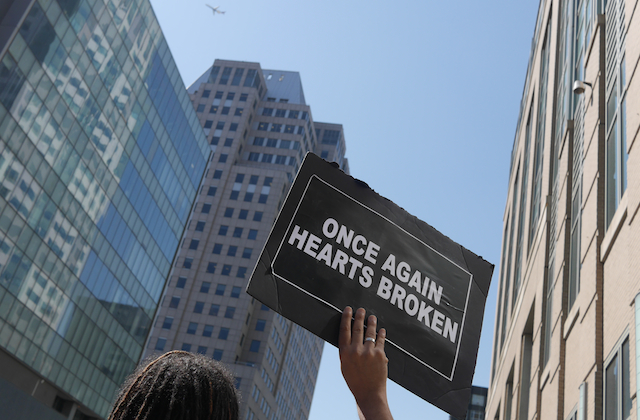 "Hands up to the sky! We want justice for Akai!" shouted dozens of people, some wearing shirts emblazoned with Black Lives Matter, others holding signs in Chinese and English voicing support for Gurley's family.