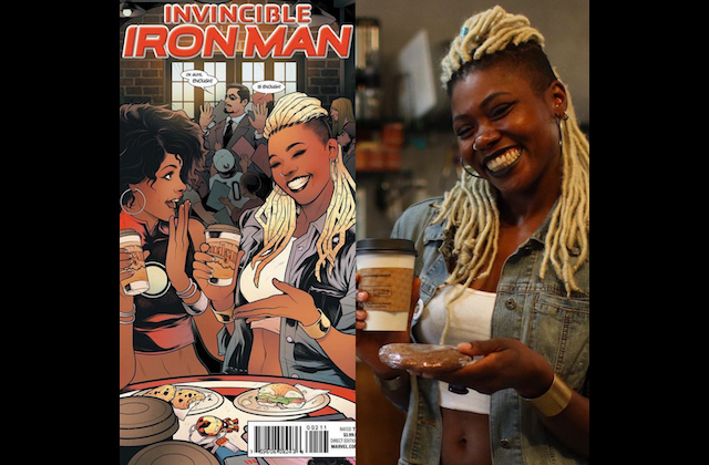 Johnson appears on a store-specific variant cover for Marvel's "Invincible Iron Man #1," enjoying a meal with another Black woman trailblazer: RiRi Williams, the new Iron Man. The comic goes on sale next month, with this alternate cover being available only at Amalgam.