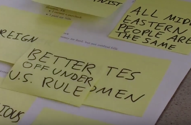 The video, which you can see above, depicts several characters wearing the weight of society's prejudices against them. A man places a note that reads "You're an ENGINEERING Ph.D. student?" on a Black woman working in a science lab. A Brown man wears one that says "TERRORIST" during a job interview. His interviewer looks over a resume with notes that read "BETTER OFF UNDER U.S. RULE" and "ALL MIDDLE EASTERN PEOPLE ARE THE SAME" while her own computer features "SMILE FOR ME" and "CALM DOWN PRINCESS." Through these scenes and others, Giant Kitty's four members—Miriam Hakim (vocals), Cassandra Chiles (guitar), Glenn Gilbert (bass) and Trinity Quirk (drums)—perform with stickers on their own bodies. As Hakim told us via email, each person in the video mined their own experiences for the Post-Its they wore. One comment Hakim, whose father is Syrian, endured in real life—"Are those boobs or bombs?"—appears on one of her sticky notes.