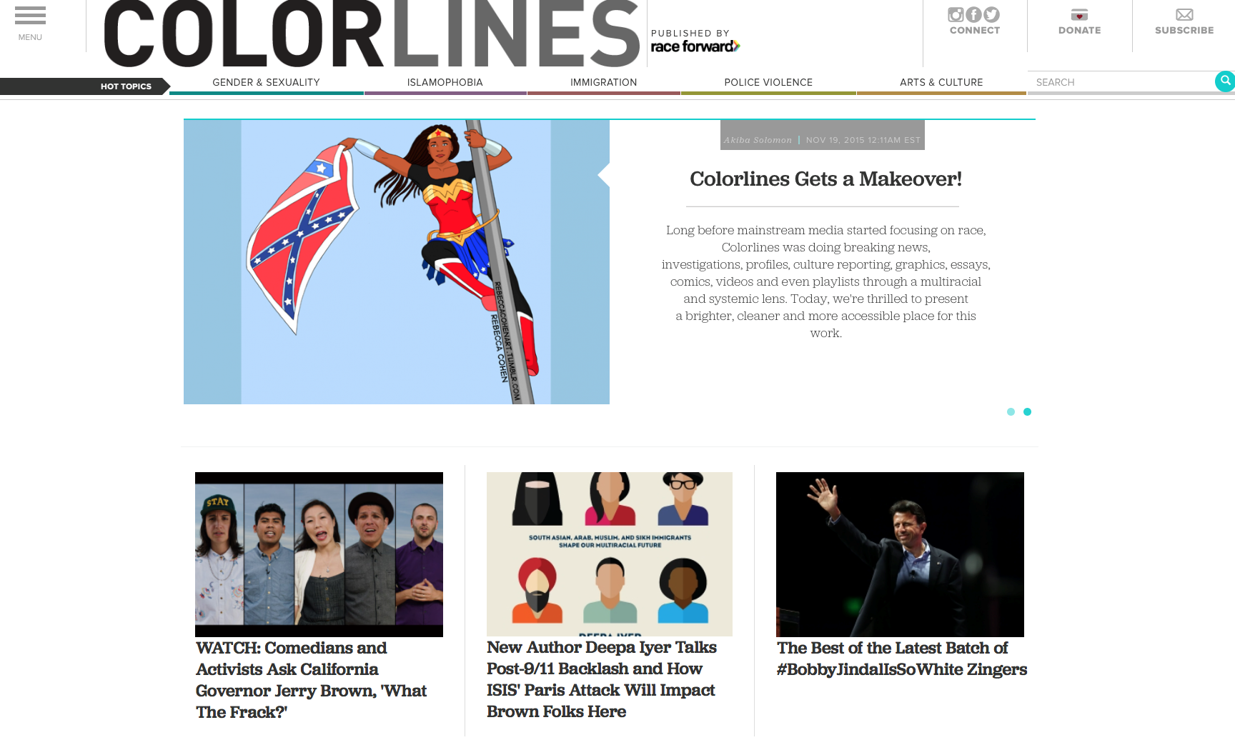 November 19, 2015 --- Colorlines, the award-winning daily news site published by racial justice organization Race Forward, today announced the redesign of its website, Colorlines.com. Changes include cleaner design, simpler navigation, enhanced search functionality, and more engaging display of multimedia content.