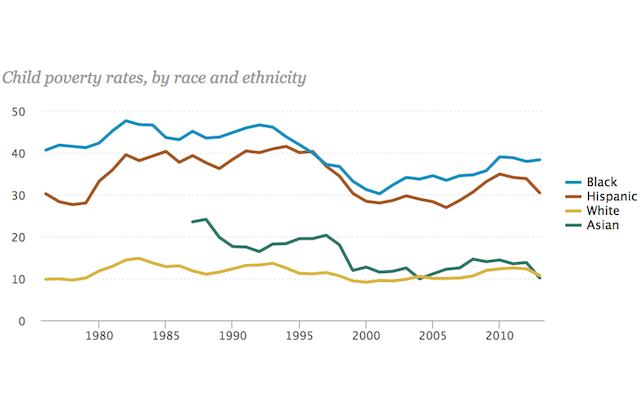 That decline came with a drop in the poverty rate for Asian, Hispanic and white children, but it held steady at 38 percent for black children. That made them nearly four times as likely to be living below the poverty line than their white and Asian counterparts. In real numbers, a very young Latino population means that there are more Hispanic children (5.4 million) in poverty than any other group, at a rate of 30 percent.