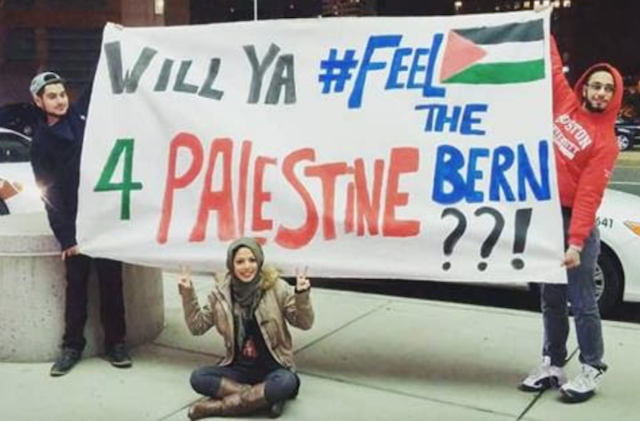 On Saturday, October 3, members of Boston Students for Justice in Palestine attended the Bernie Sanders rally with a sign that read “Will Ya #FeelTheBern 4 Palestine?” We held our sign quietly and respectfully in the overflow area, and did not block any of the rally screenings or walkways. We received a warm welcome from surrounding Bernie supporters and rally participants, many of whom also carried signs.