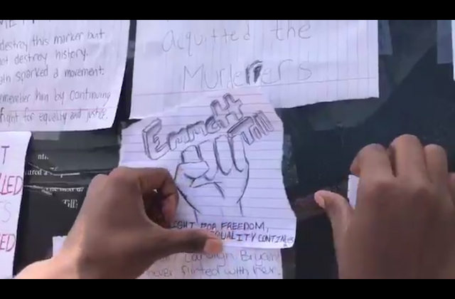 A multiracial group of students from St. Louis offered a tribute to the legacy of Emmett Till by posting handwritten messages and portraits on a recently vandalized historical marker honoring him in Money, Mississippi.
