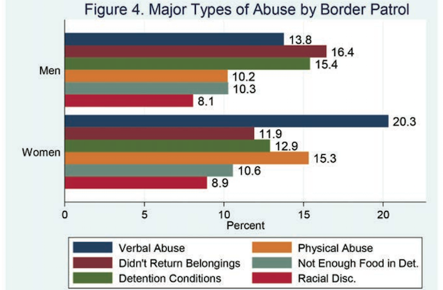 One in three deported migrants who took the survey reported some type of abuse or mistreatment by Border Patrol agents or while in Department of Homeland Security (DHS) custody. Broken down by gender, 35 percent of women experienced abuse, versus 31.8 percent of men. For women, verbal abuse was the most common (20.3 percent), while men most frequently cited having their belongings taken and not returned (16.4 percent). Other reported issues included poor detention conditions (14.5 percent for men and women), physical abuse (12 percent), lack of food in detention (10.3 percent) and racial discrimination (8.4 percent). Despite the rampant mistreatment, the report found that just 7.7 percent of the survey respondents filed a complaint with U.S. immigration authorities, with many saying they didn’t think it would matter and that they feared it would lead to retaliation.