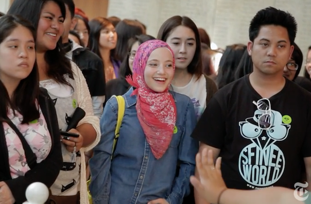 The above short depicts the hijab-wearing teen's experiences at an all-girls' Catholic school, where she stands apart from her largely Latinx and Asian-American classmates during prayers. Meltzer juxtaposes those scenes with others showing her life in Los Angeles: walking with a Korean-American classmate through L.A.'s Koreatown, playing sports while wearing a hijab and, towards the short's end, attending a protest against Donald Trump's immigration policies.