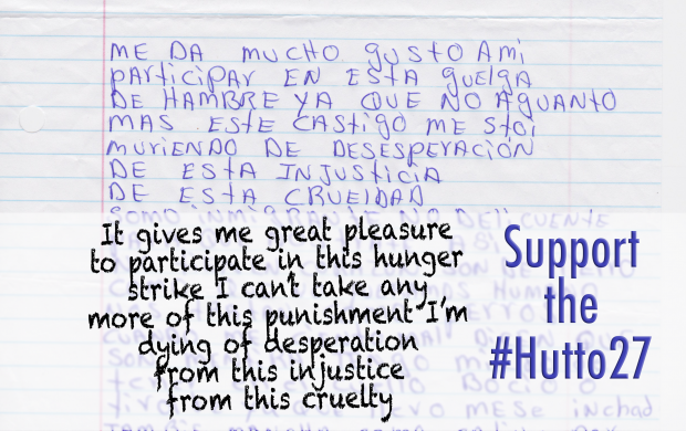 Two women have faced solitary confinement that we know of. Insis [Maribel Zelaya Bernardez] was placed in solitary at Hutto the first weekend of the hunger strike. This was confirmed by her attorney and friend who went and demanded to see her and a letter she wrote about the experience. Francisca, who was moved to Pearsall, has been in solitary since she arrived. We and her family are extremely concerned about her well-being and want her released to pursue to case outside of detention as soon as possible. It is worth explaining here that ICE will say they do not have any solitary confinement cells in immigrant detention. But what they leave out is that they do have single cells in the medical units and this is where they will lock women up, under the pretext of medical care. But it is obvious to the women that it is a punishment, especially since they have reported that don’t see anyone while they’re in there, including any doctors or nurses. This was what we saw in the reports of solitary used against mothers and children during the Karnes hunger strikes.