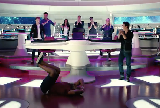 The dancing came at the tail-end of what was otherwise a choreographed video by the stars of the Star Trek film (including returning stars Zoe Saldaña and John Cho) for a philanthropic initiative called "Star Trek: To Boldly Go." Fans can bid on a variety of products ranging from "Star Trek" memorabilia to advanced personal screenings of the new film, while also being entered for a chance to star in a walk-on role.