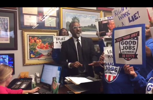 On February 1, Representatives Joe Wilson (R-S.C.) and Steve King (R-Iowa) co-sponsored the National Right-to-Work Act (H.R. 785). Today (February 8), Joseph Geevarghese, director of advocacy group Good Jobs Nation, led workers of color to Wilson’s office to explain why he thinks the bill is bad for America.