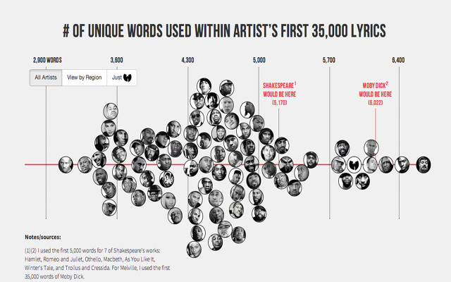 Would you believe it if I told you that Snoop, 2pac, Kanye West and Lil' Wayne were just average rappers? That's according to a data visualization of the largest vocabularies in hip-hop by designer Matt Daniels.